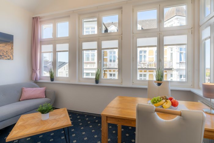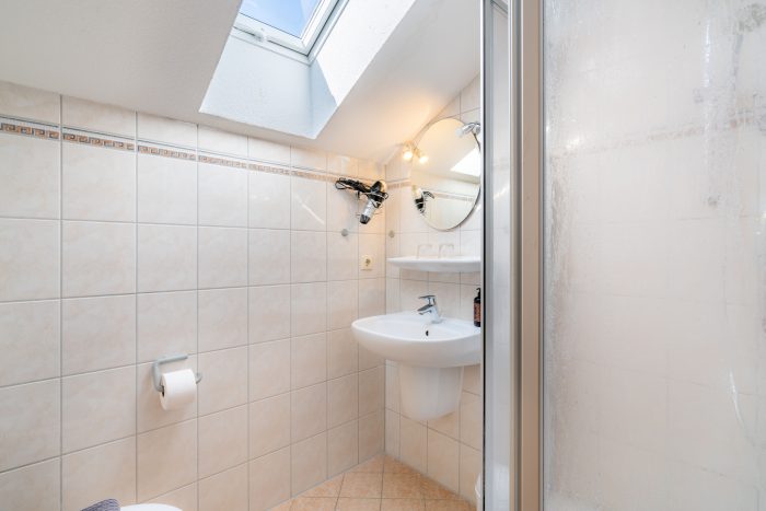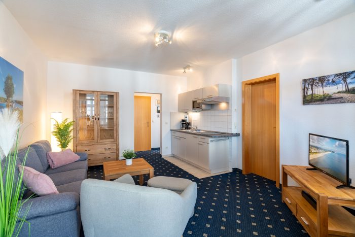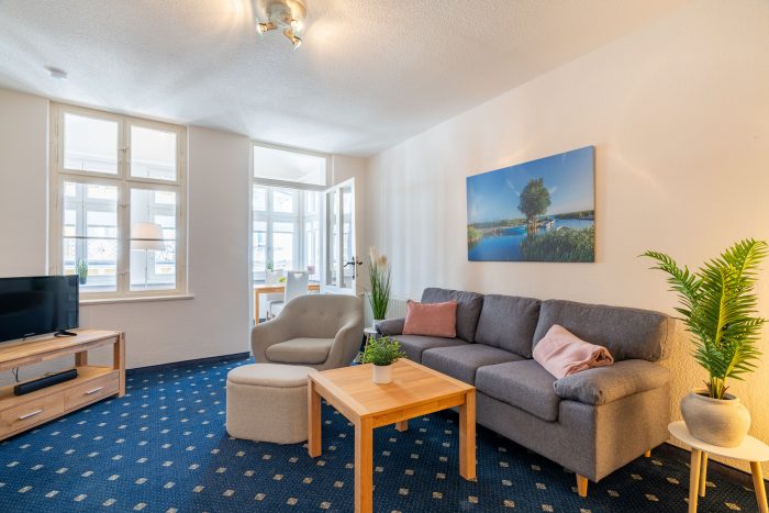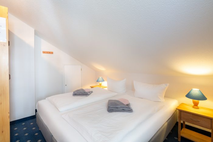 • 2. Obergeschoss• ca. 45 m²• bis zu 2 Personen• Wohnzimmer• Küchenzeile• Schlafzimmer mit Doppelbett• Kofferkammer• Veranda• Dusche/WC• Diele